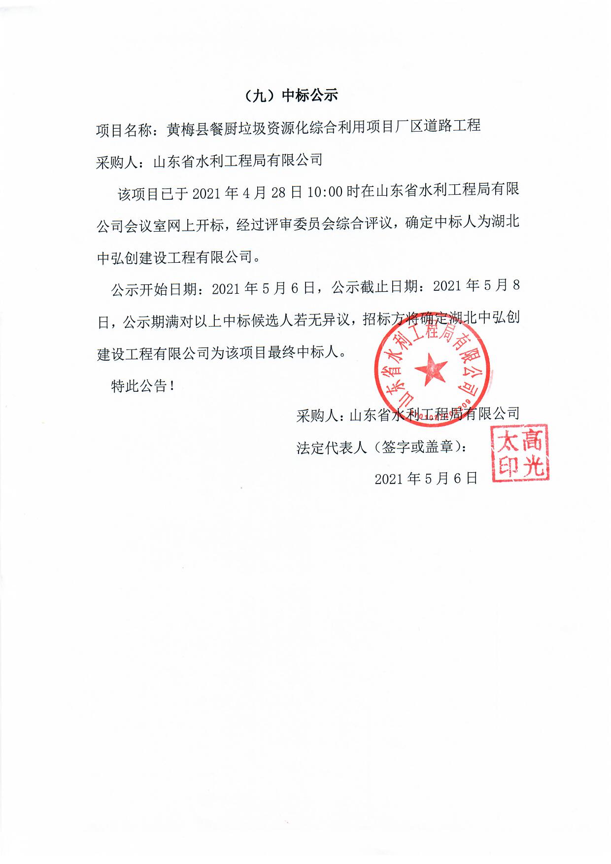 黃梅縣餐廚垃圾資源化綜合利用項目廠區(qū)道路工程中標(biāo)公示