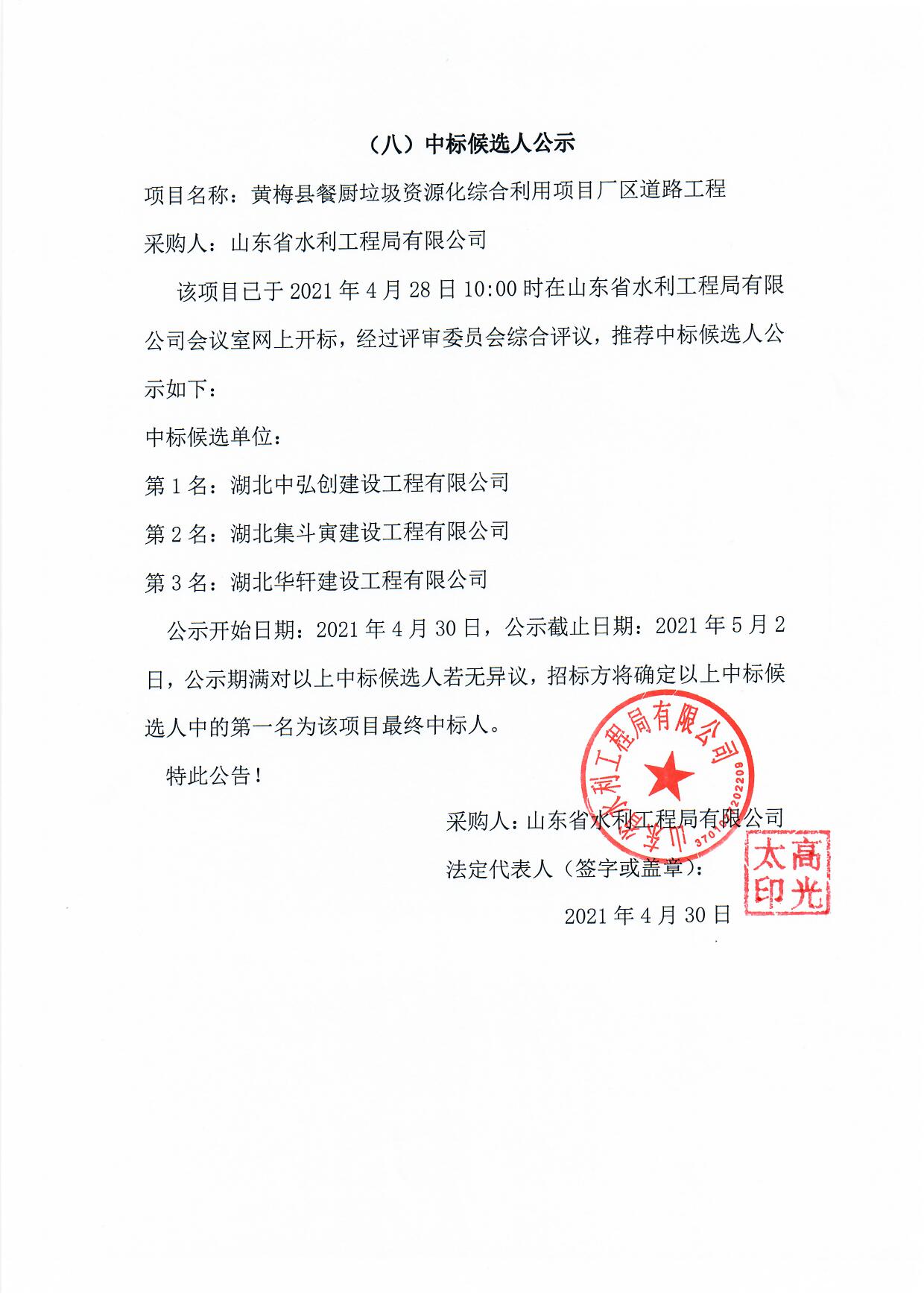 黃梅縣餐廚垃圾資源化綜合利用項目廠區(qū)道路工程中標候選人公示