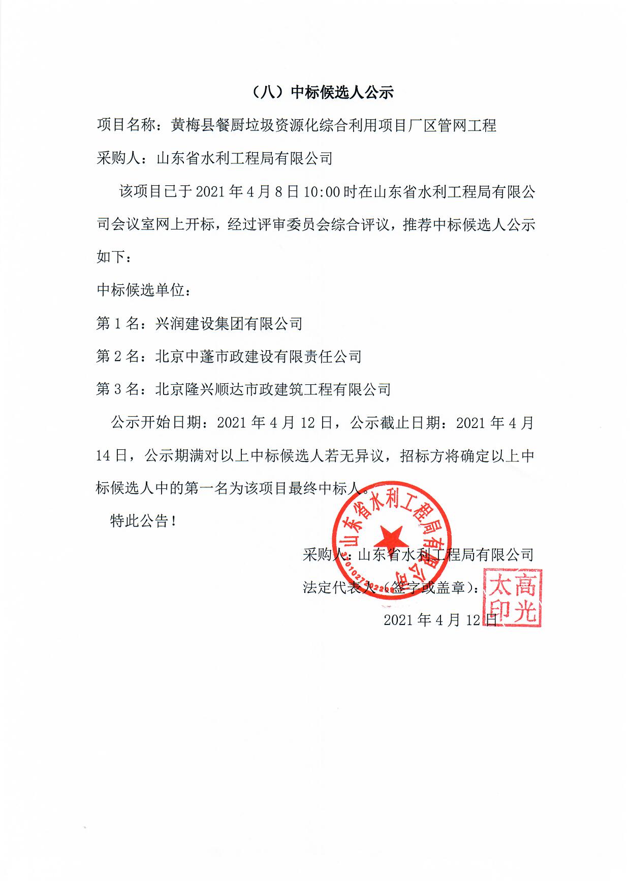 山東省水利工程局有限公司餐廚垃圾處理廠智能信息化管控平臺(tái)中標(biāo)候選人公示