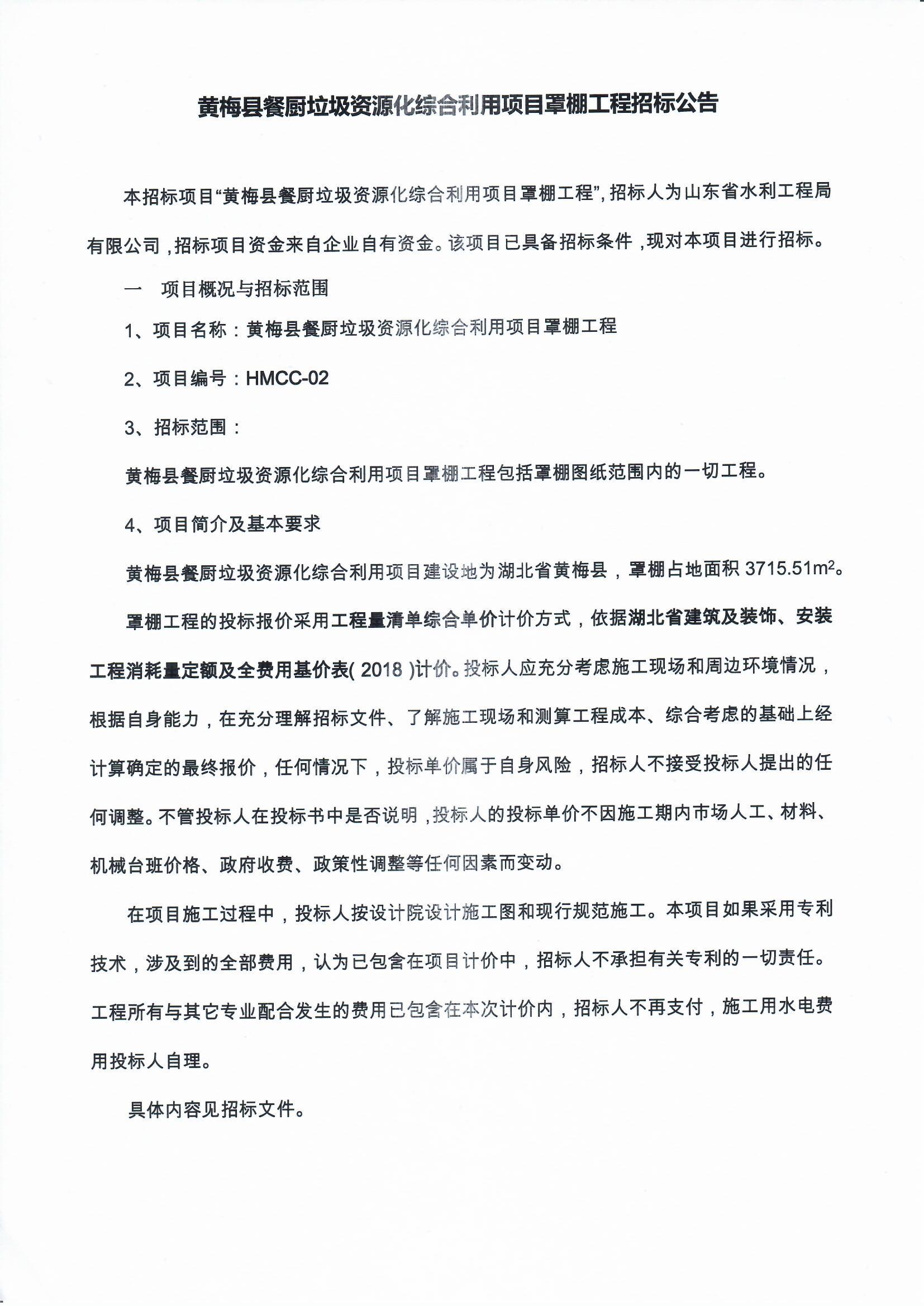 黃梅縣餐廚垃圾資源化綜合利用項(xiàng)目罩棚工程招標(biāo)公告