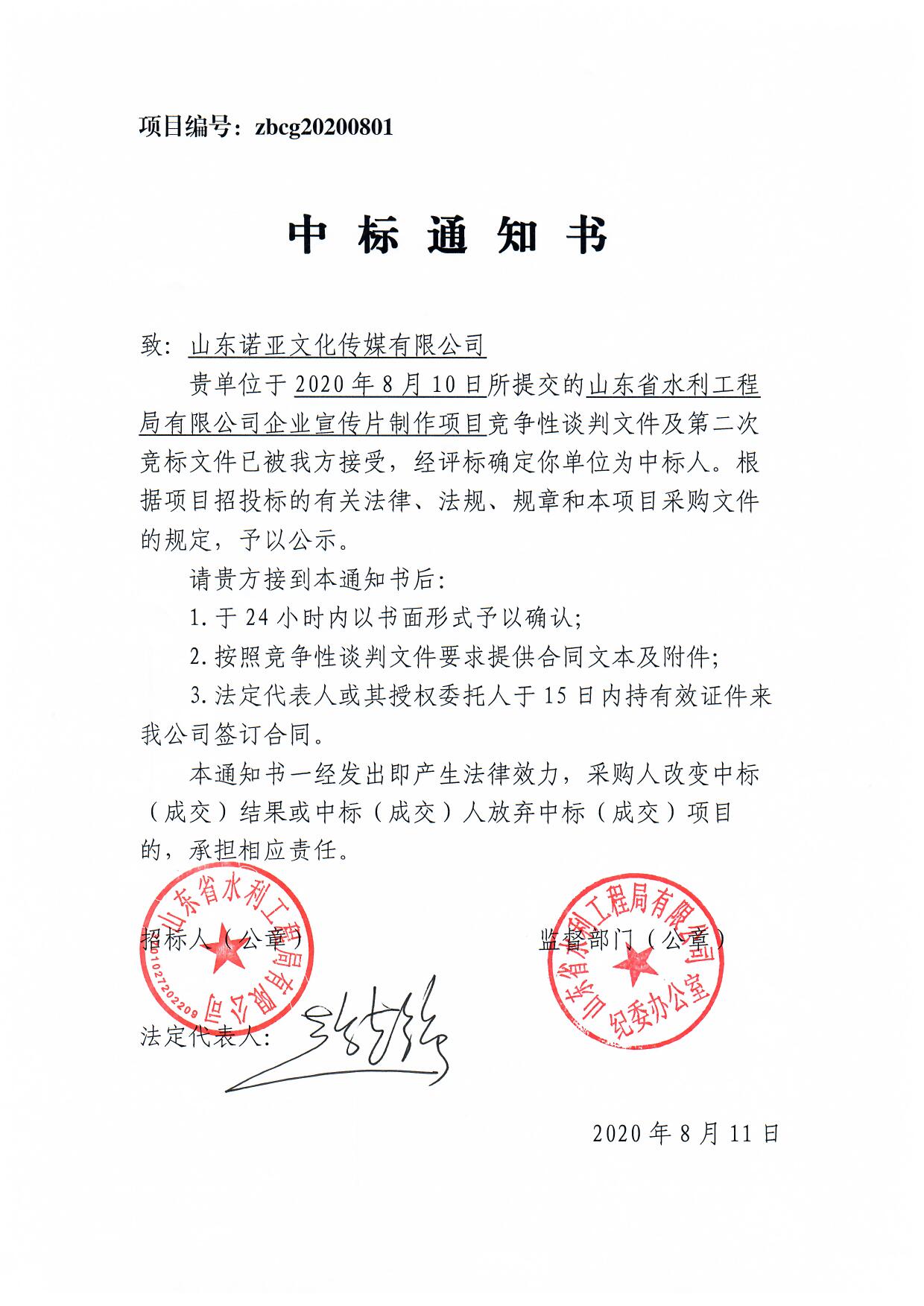 山東省水利工程局有限公司企業(yè)宣傳片制作項(xiàng)目中標(biāo)公示